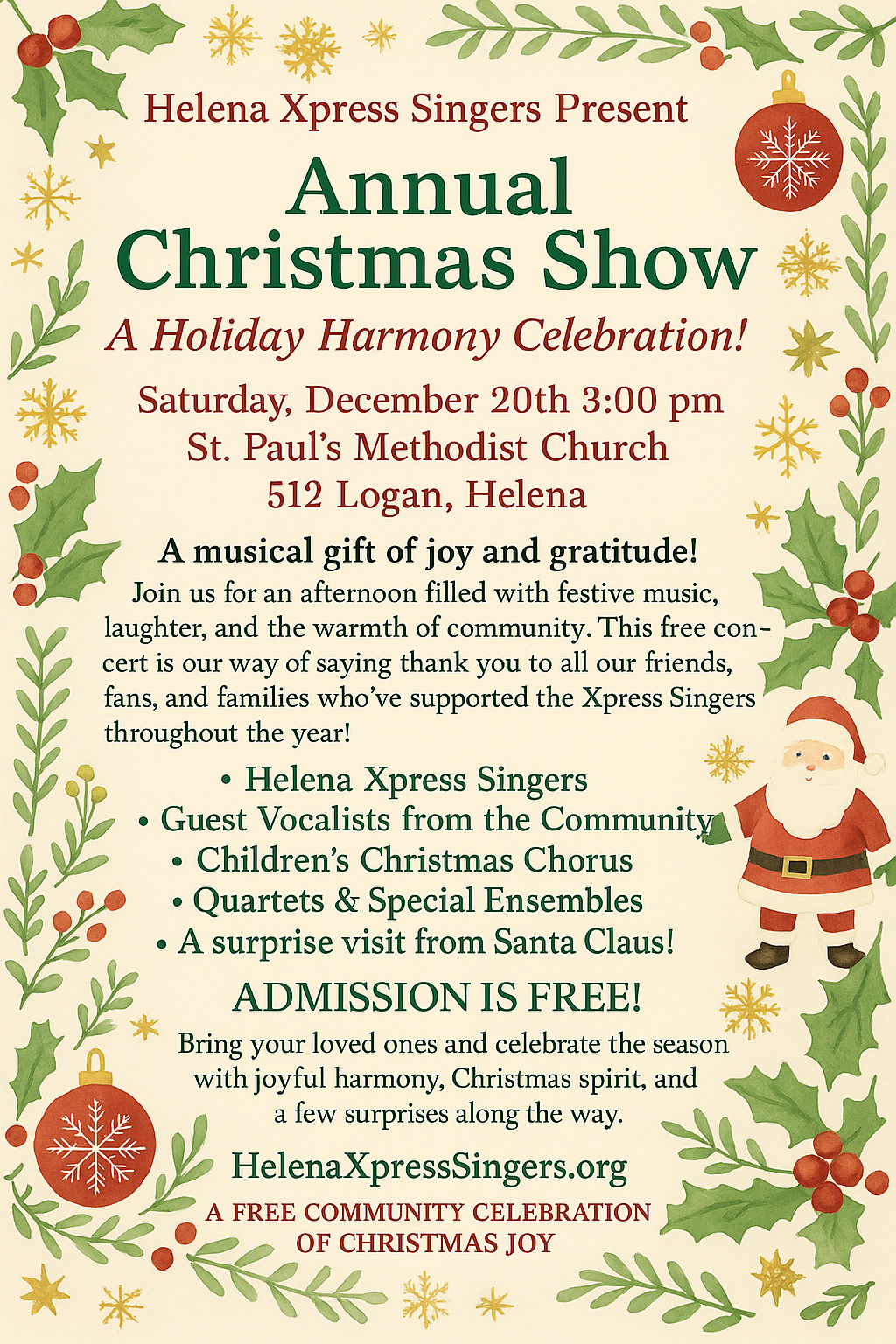 3:00pm, Sat, Dec 20 2025Members of the Helena Xpress Singers and guests from the community will present their 2025 Christmas Show, Saturday, December 20th, 3pm, at St. Paul's Methodist Church, 512 Logan. In ... moreChorus Rehearsal - New Year Celebration - Guests are always welcome